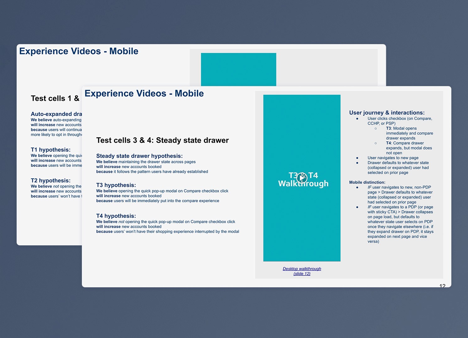 Defined test variants to answer key experience questions, i.e. Do users prefer the tool to appear instantly? Does the tool interrupt the user shopping experience? Should the tool persist across pages? Produced internal walkthrough videos of each variant to reduce ambiguity and help product, legal, and tech partners quickly align to these nuance user journeys.